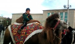 Житель села Китай со своей верблюдицей Зитой зарабатывает на площади Каракола